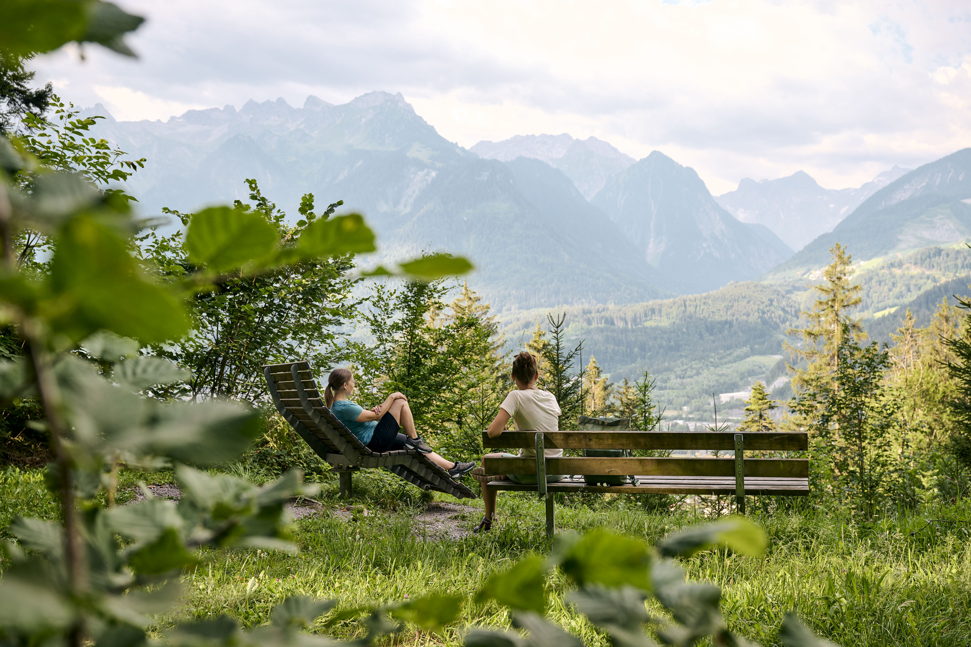 Am Ende des Schloßweges, direkt bei der Ruine Sonnenberg, treffen beide Wegvarianten im Ortsteil "Kälberbünt" wieder zusammen. Der Weg führt ab hier ein Stück über die Forststraße bergwärts. Bei der nächsten Abzweigung mit Wegweisern dem Weg Richtung Kreuzboden, Hinteroferst und Nüziders folgen. Ab hier über Forststraßen und Waldwege weiter. Auf diesem Wegstück bieten sich immer wieder kurze Pausen auf Rastplätzen mit Ruheliegen an - besonders schön ist der Aussichtspunkt "Grafen Känzele". Das Grafen Känzele befindet sich nicht direkt auf dem Weg, der kurze Abstecher lohnt sich aber auf jeden Fall - dort befindet sich auch die Informationstafel Nr. 5 und es erwartet Dich ein sensationeller Ausblick.