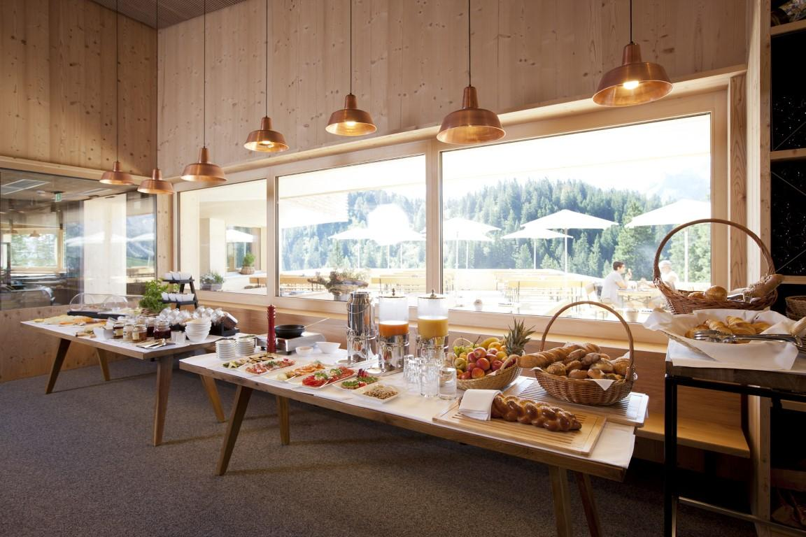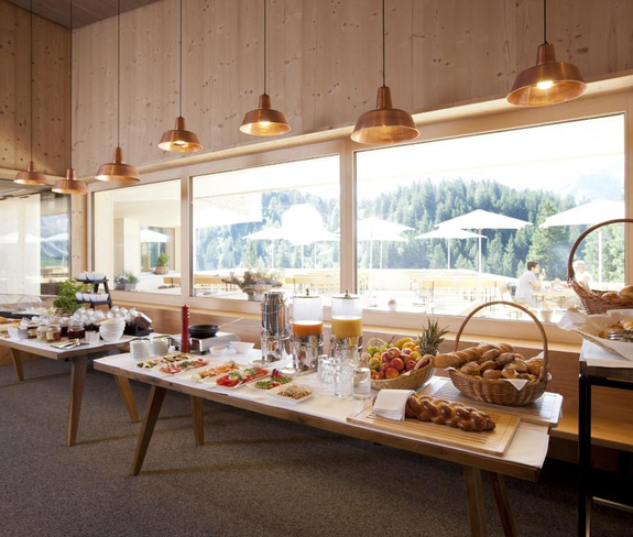 Das große Bergfrühstück vom Buffet mit reicher Brotauswahl, vielfältigen Köstlichkeiten aus der Genussregion Vorarlberg, Müsli-Ecke, Rühreiern und vielem mehr.