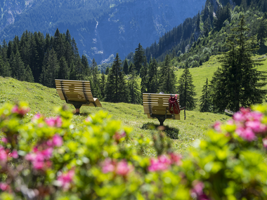 From the parking lot at the Kristbergsaal follow the signs Freiburger Hütte to the train station Dalaas, over the bridge to the district Obermarias, at the junction on the hiking trail over the Sandtobel and through the Sponasa to the district Obermason. Pass the chapel of St. Martin, then turn right past the last farm and over Bargand through beautiful alpine meadows. In Bargand also the theme trail Stebok-Wäg starts. From here you are accompanied by information boards and numerous ibexes. Continue to the right of the Schmiedetobel into the area of the Musterinalpe, then in serpentines to the Alpe Rauher Staffel and from there via a wide road to the Freiburger Hütte. Return via the same path or alternatively with the hiking bus (Attention: only cash payment possible) from Alpe Formarin to Lech and with the bus back to Dalaas.
